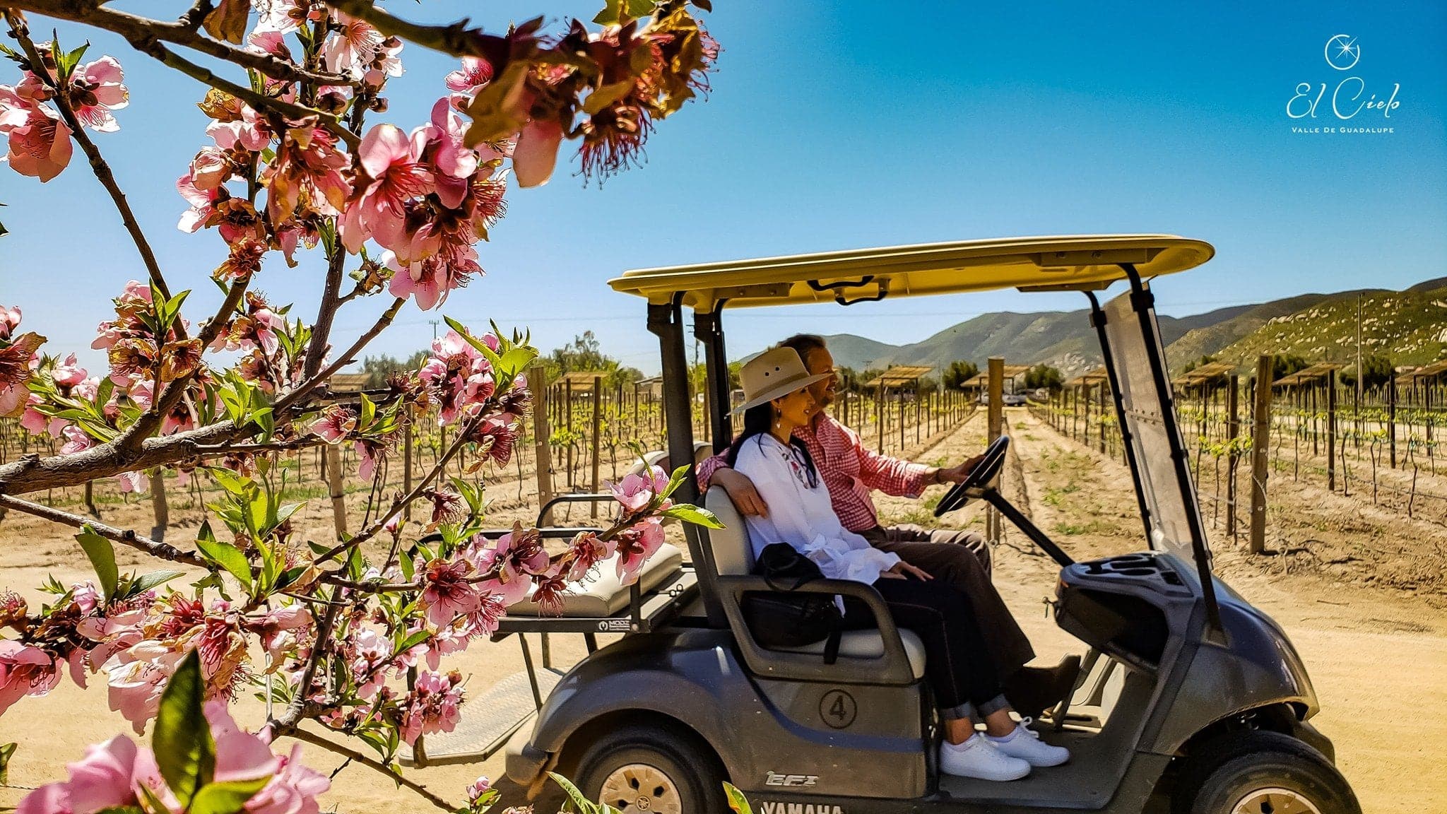 :Disfrute recorrer nuestros viñedos con su familia o amigos en carritos de golf y admire los paisajes del Valle de Guadalupe, nuestro huerto, olivos y vides.